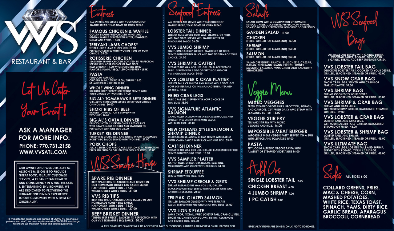 Grilled Salmon Glazed with VVS Teriyaki Sauce. Served with your choice of Two Sides.
